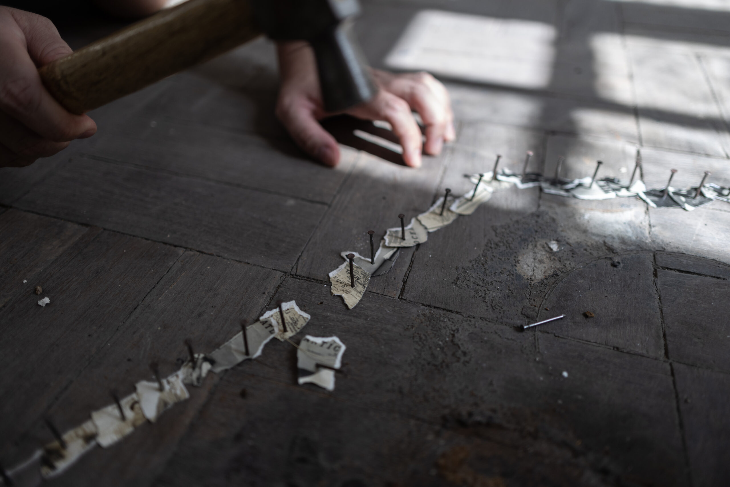 Em segundo lugar, há um conjunto de trabalhos em torno das “escritas de si”, cujo cerne é a exploração da auto ficcionalização, da fabulação das identidades e da aproximação entre o individual e o coletivo; o íntimo e o público. Aqui, com mais ou menos ênfase, vemos a presença da primeira pessoa, em que se identificam aspectos de discurso autobiográfico. Não se trata, porém, de performar a autoficção para estabelecer uma identidade fixa e unívoca, ao contrário, o gesto se aproxima mais do reconhecimento de um outro — o estrangeiro, o estranho — no seio de si mesmo. Benedito Ferreira se debruça sobre os rituais que envolvem a sua participação como artista homenageado pela prefeitura de sua cidade natal no interior de Goiás, nos fazendo refletir a respeito dos códigos sócio-simbólicos que envolvem a ideia de arte no senso comum. Thadeu Dias também parte de experiências pessoais (especialmente amorosas) para engendrar uma paisagem impossível — parte registro de um acontecimento, parte especulação poética. Cássia Nunes cria um projeto irreal que pretende criar uma linha cítrica (composta por cascas de laranjas descascadas) entre as cidades de Goiânia e Rio de Janeiro, itinerário que compõe o percurso onde a artista nasceu e onde vive. Luiz Sisinno revisita a história de um tio-avô misterioso, enquanto Mariana do Vale quebra os pratos herdados da avó numa casa em ruínas, ambos buscando renegociar com as memórias e fatos do passado.