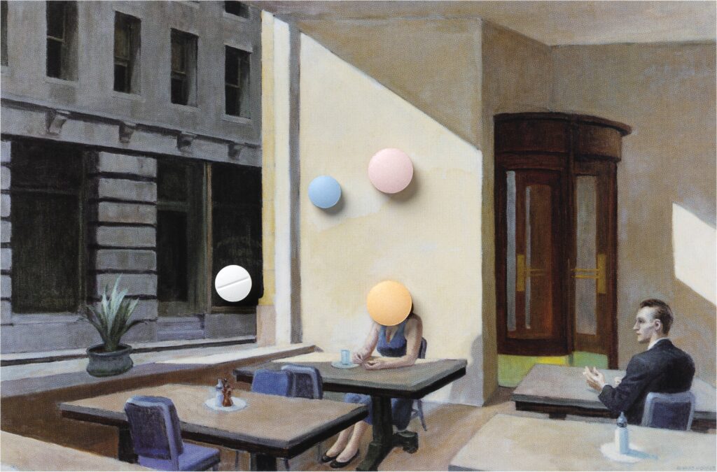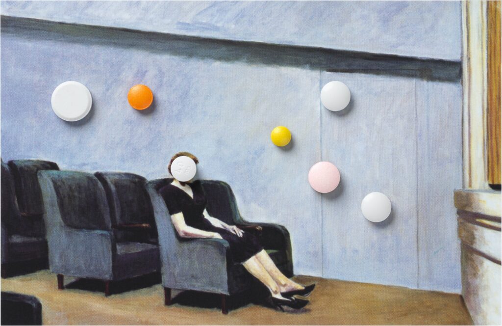 Disponho os medicamentos de minha avó sobre imagens de obras de Edward Hopper publicadas em um livro de capa dura. A cada nova combinação entre comprimidos e imagem, registra-se um momento do avanço do Alzheimer e das transformações de nossa relação cotidiana. As fotografias acompanham o percurso que vai dos primeiros remédios até a sua morte, em 2023, constituindo uma sequência em que cuidado, memória e perda se inscrevem na superfície das imagens.