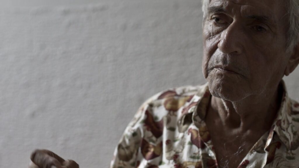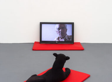 The artist films Dom, a dancer and actor from Goiás, as he recites Versos Íntimos, by the Brazilian poet Augusto dos Anjos. In attempting to recite the poem continuously, Dom stumbles over certain words, interrupts the flow, hesitates, corrects himself, and starts again. His speech is traversed by lapses of memory and small deviations that reveal the effort of remembering. From this situation, a rehearsal scene is constructed, grounded in the relationship of trust between artist and performer. Dom is accompanied by a black panther plush toy lying on a mat, as if occupying the place of a silent witness. The presence of the panther resonates with the poem itself, in which the image of the animal appears as a figure of intensity and threat.
