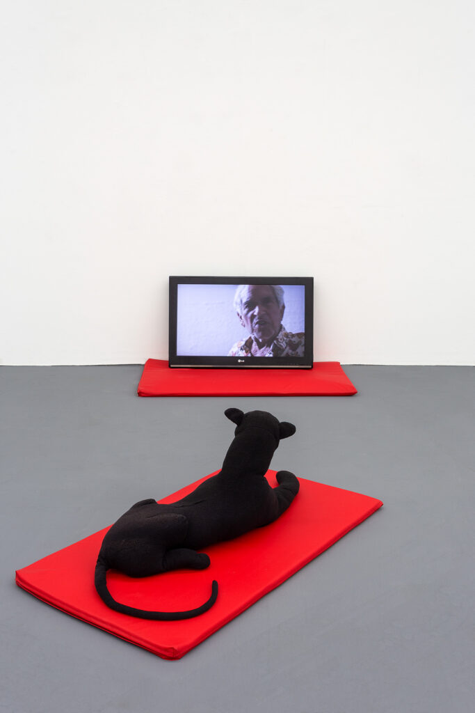 O enterro de sua última quimera: vídeo (10′, cor, som, loop); monitor de tv, colchonetes, pantera em pelúcia, 2024.