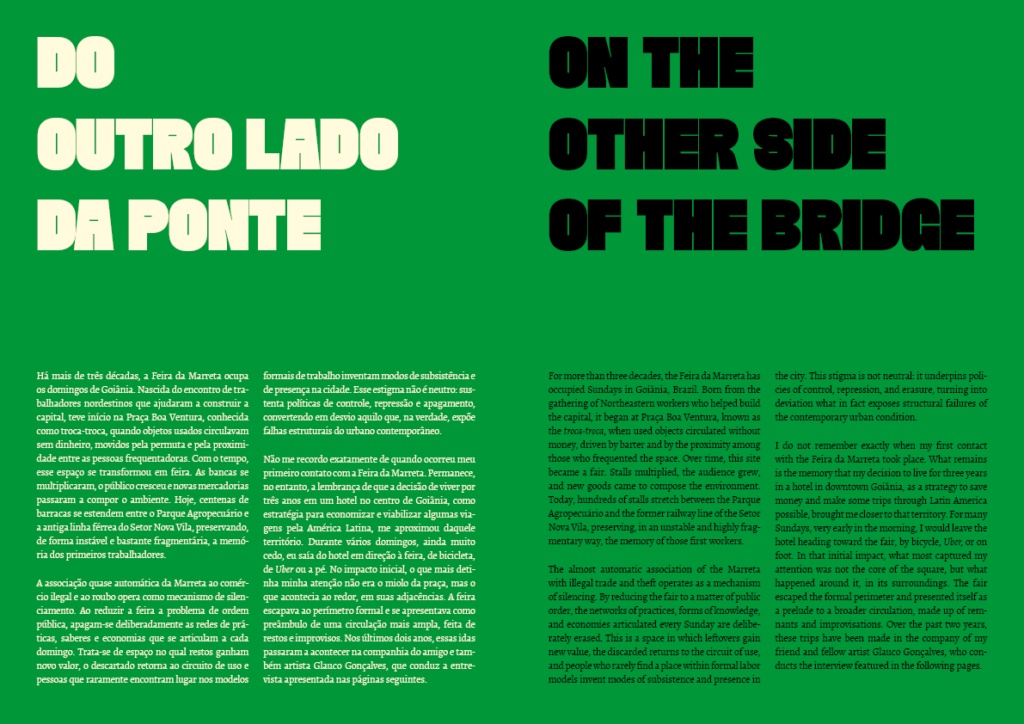 Telhado no Bolso investiga a cidade a partir da caminhada, da observação direta e do contato com formas precárias de circulação e trabalho urbano. Desenvolvido na Feira da Marreta, em Goiânia, articula fotografia e escrita como práticas indissociáveis, tratando a imagem não como documento fechado, mas como matéria em trânsito, atravessada por encontros fortuitos, restos, objetos deslocados e pequenas narrativas do cotidiano. O título evoca a ideia de abrigo móvel e provisório, um “telhado” que se carrega consigo, apontando para modos informais de habitar a cidade e para economias do improviso. A pesquisa se desdobra em um conjunto de ações públicas que tensionam os formatos tradicionais de exibição e mediação. Entre elas, destacam-se encontros de ateliê aberto, nos quais o público acessa materiais em processo, fotografias, anotações e arquivos do artista, assim como ciclos de leitura de portfólios voltados a jovens artistas e fotógrafos. Soma-se a essas ações a disponibilização on-line do caderno digital, que reúne imagens e textos produzidos ao longo das deambulações pela feira e se afirma como espaço de experimentação editorial e deriva. Em seu conjunto, Telhado no Bolso propõe uma prática artística baseada no compartilhamento de processos, na escuta e na atenção às micropolíticas do urbano.